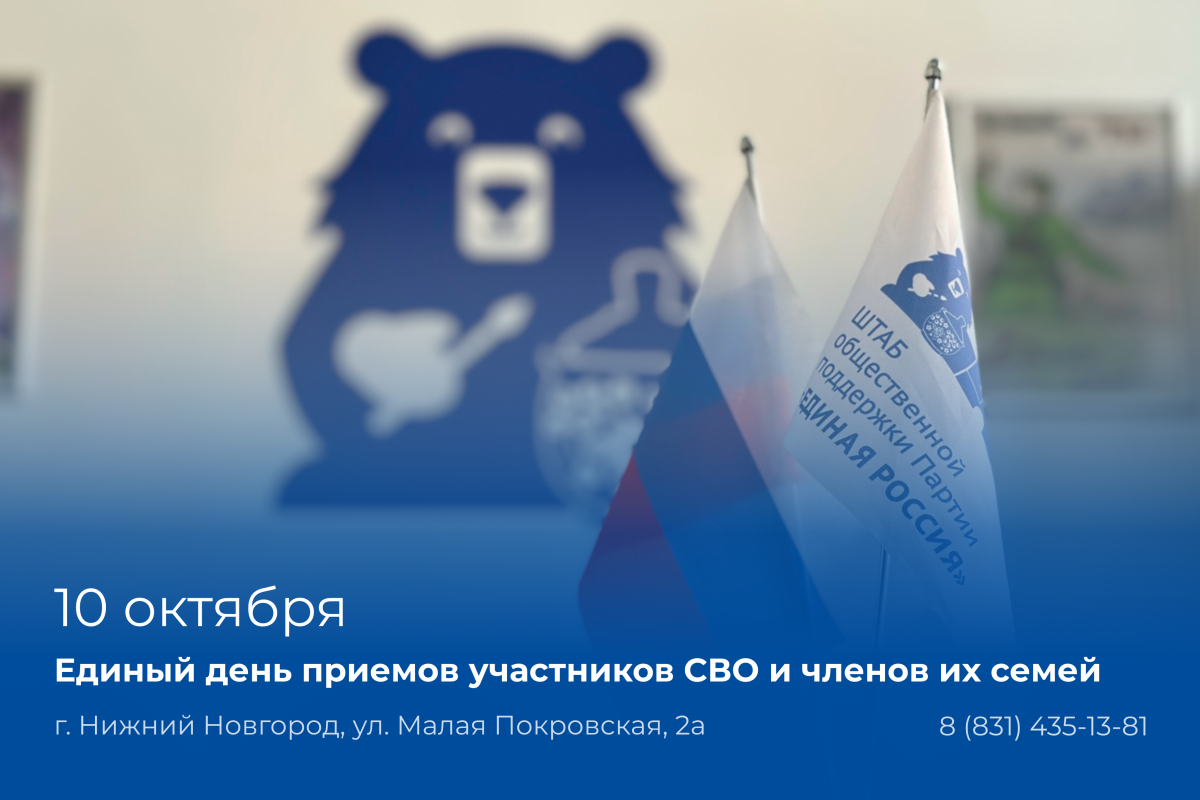 10 октября в партийных общественных приемных состоится Единый день приемов участников СВО и членов их семей. Со своими вопросами они могут обратиться в Региональную и местные общественные приемные «Единой России», депутатские центры и Штаб общественной поддержки.